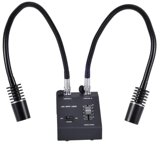 Dupla hattyúnyakas LED világítás sztereo mikroszkóppal történő munka során lehetővé teszi, hogy tetszőleges szögben világítsuk meg a vizsgálni kívánt tárgyat Az egyenként kb. 56 cm hosszú flexibilis karon elhelyezkedő LED világítás 2 x 3W teljesítményű. A LED-ek színhőmérséklete 3200 K. A potméter segítségével együttesen változtatható a fényerő szintje.