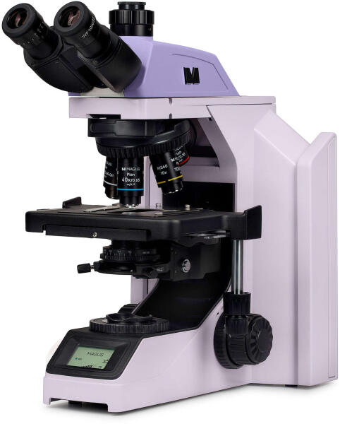 Nagyítás: 40x–1000x. Háromszemlencsés mikroszkóp fej, kódolt revolverfej, sík akromatikus objektívek, 3 W-os LED világítás, intelligens világítás-szabályozó rendszer